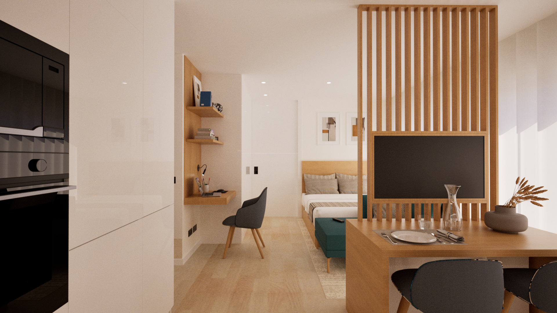 A mesa de refeições e a secretária embutida garantem soluções práticas para o dia a dia, enquanto o mobiliário seleccionado — da cama à chaise longue em verde profundo — acrescenta conforto e personalidade.