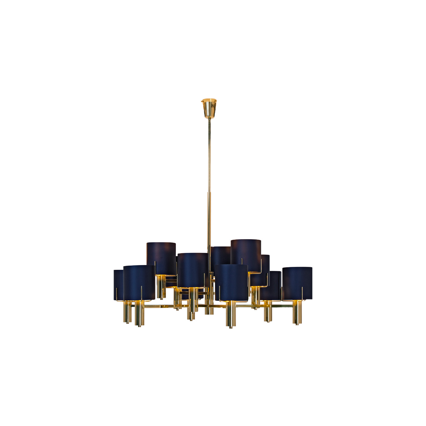 Candeeiro de teto em aço pintado a cor latão polido com abajures em tecido. Uma peça repleta de elegância.