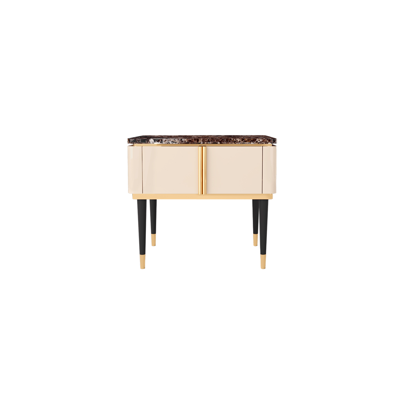 Mesa de cabeceira de uma gaveta, com estrutura em lacado alto brilho, puxador e detalhe nos pés em aço pintado à cor latão e tampo em mármore. Uma peça de design sofisticado, ideal para o seu espaço.