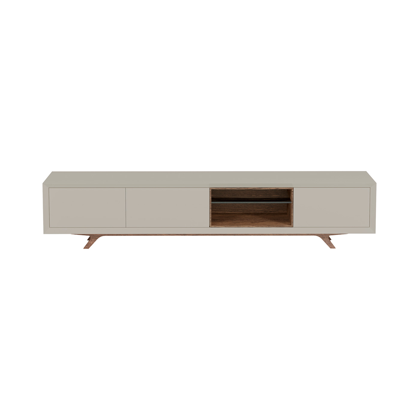 Móvel TV de três gavetas com estrutura em lacado alto brilho e nichos em nogueira e vidro. A peça ideal para uma sala moderna.